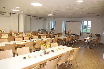 Das Gebäude bietet im ersten Stock einen Mehrzweckraum (MZR 1+ MZR 2) für bis zu 100 Personen. Dieser Saal ist durch eine Wand teilbar, sodass auch zwei kleinere Räume für Arbeitskreise genutzt werden können.